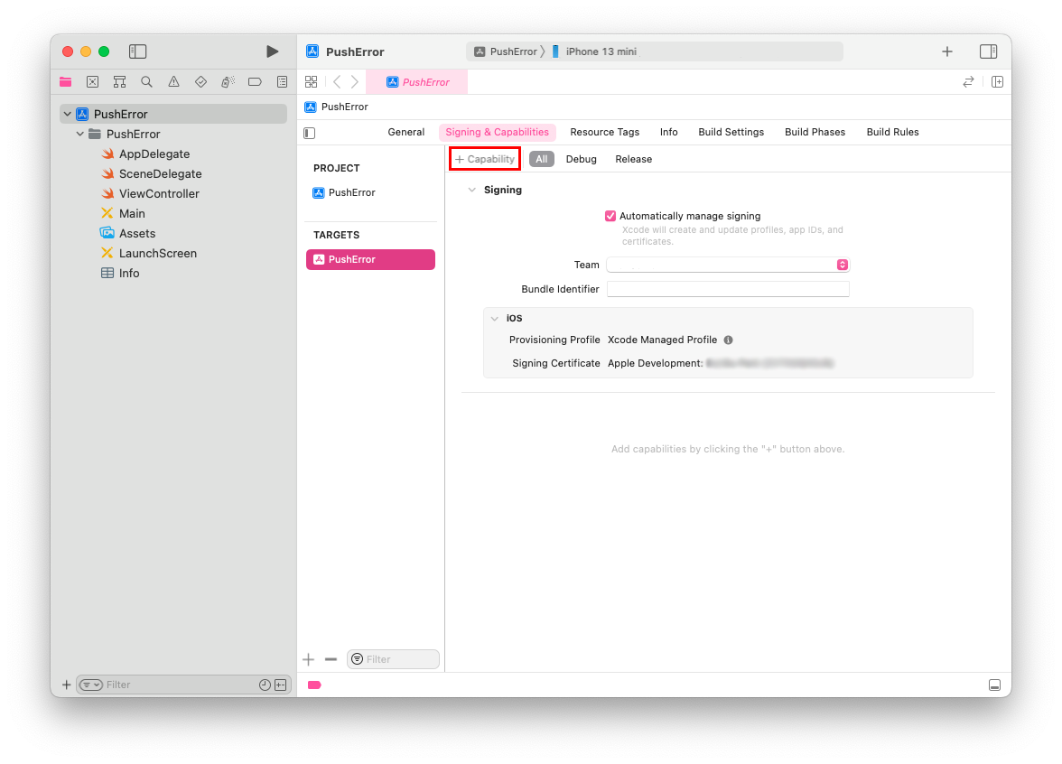 추가하면 entitlements 파일이 추가되고, 이후 위 오류가 발생하지 않는다.