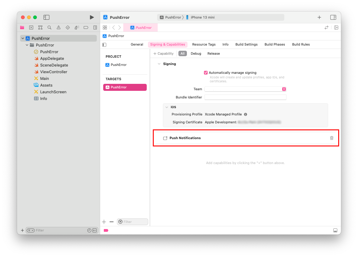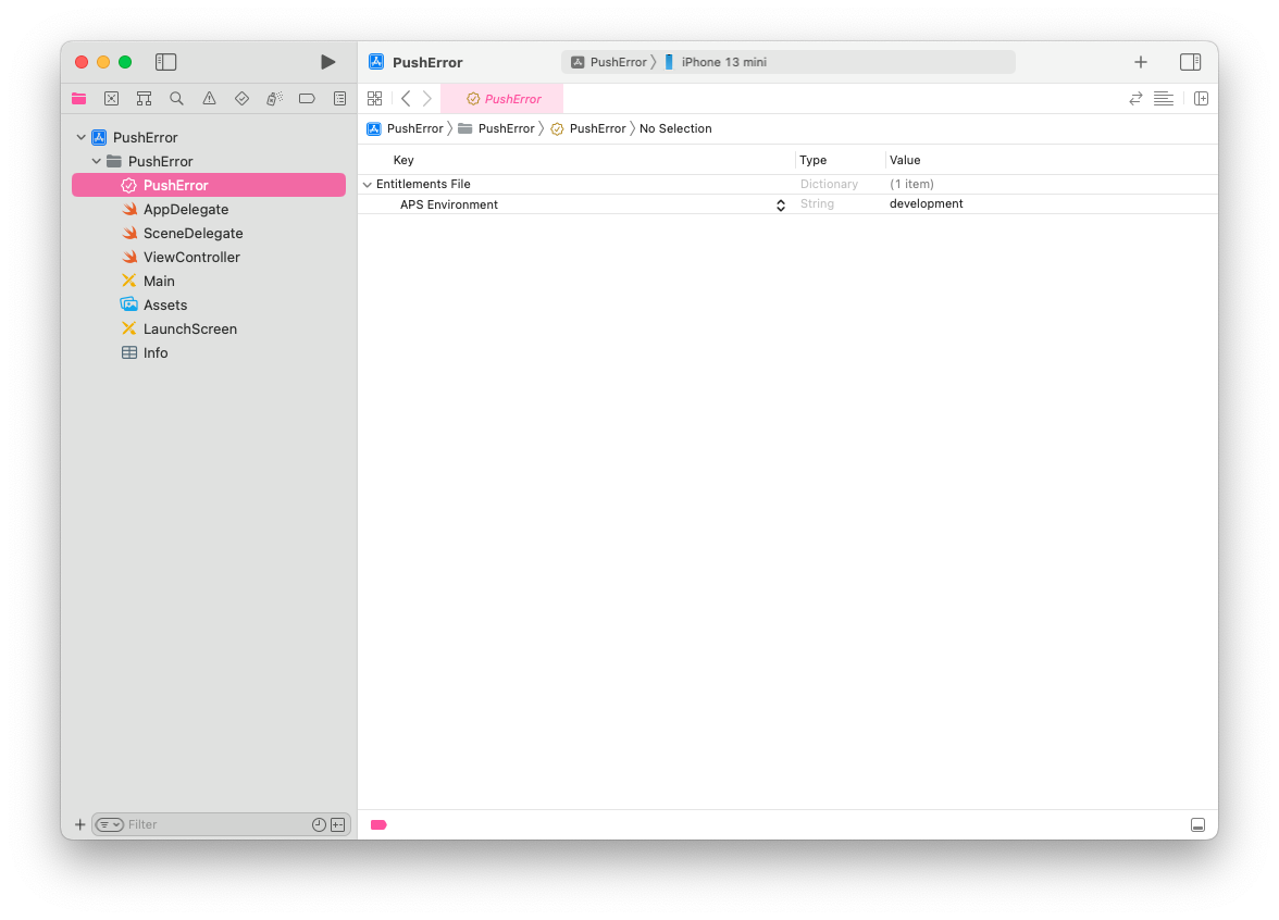 Failed to register: Error Domain=NSCocoaErrorDomain Code=3000 "응용 프로그램을 위한 유효한 ‘aps-environment’ 인타이틀먼트 문자열을 찾을 수 없습니다." UserInfo={NSLocalizedDescription=응용 프로그램을 위한 유효한 ‘aps-environment’ 인타이틀먼트 문자열을 찾을 수 없습니다.}