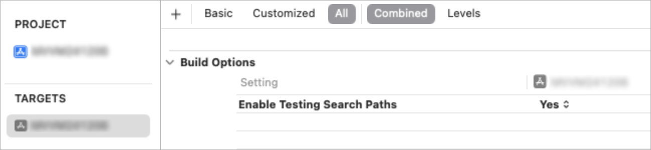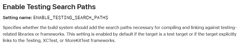 TARGETS > Build Options > Enable Testing Search paths 옵션을 'Yes'로 변경해 주면 된다.